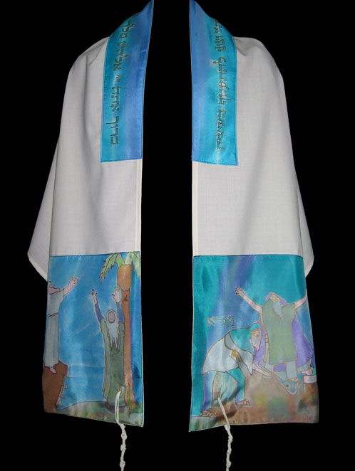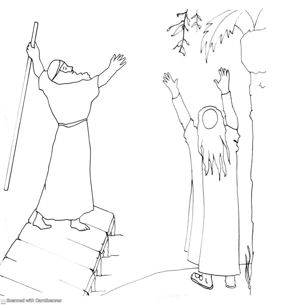 Aaron stands by the Nile, rod lifted, about to smote it and turn it to blood. Moses stands nearby, arms lifted to God in prayer.