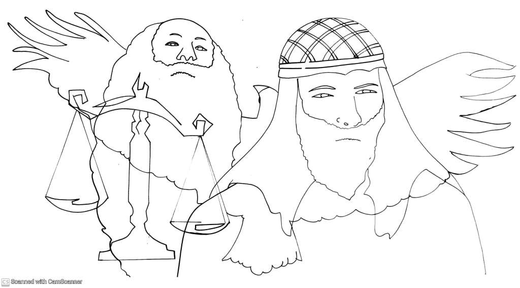 A montage of themes from Moses’ farewell poem: the eagle who treats his young with love and affection, like G-d, who has everlasting patience for his people; the scales of justice; Moses, the elderly lawgiver; and Joshua Ben Nun who is about to take his place.