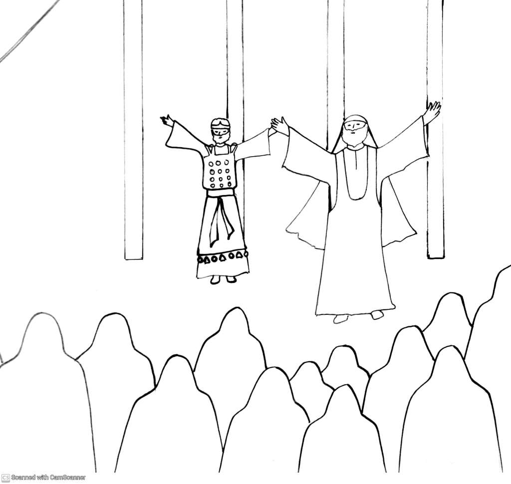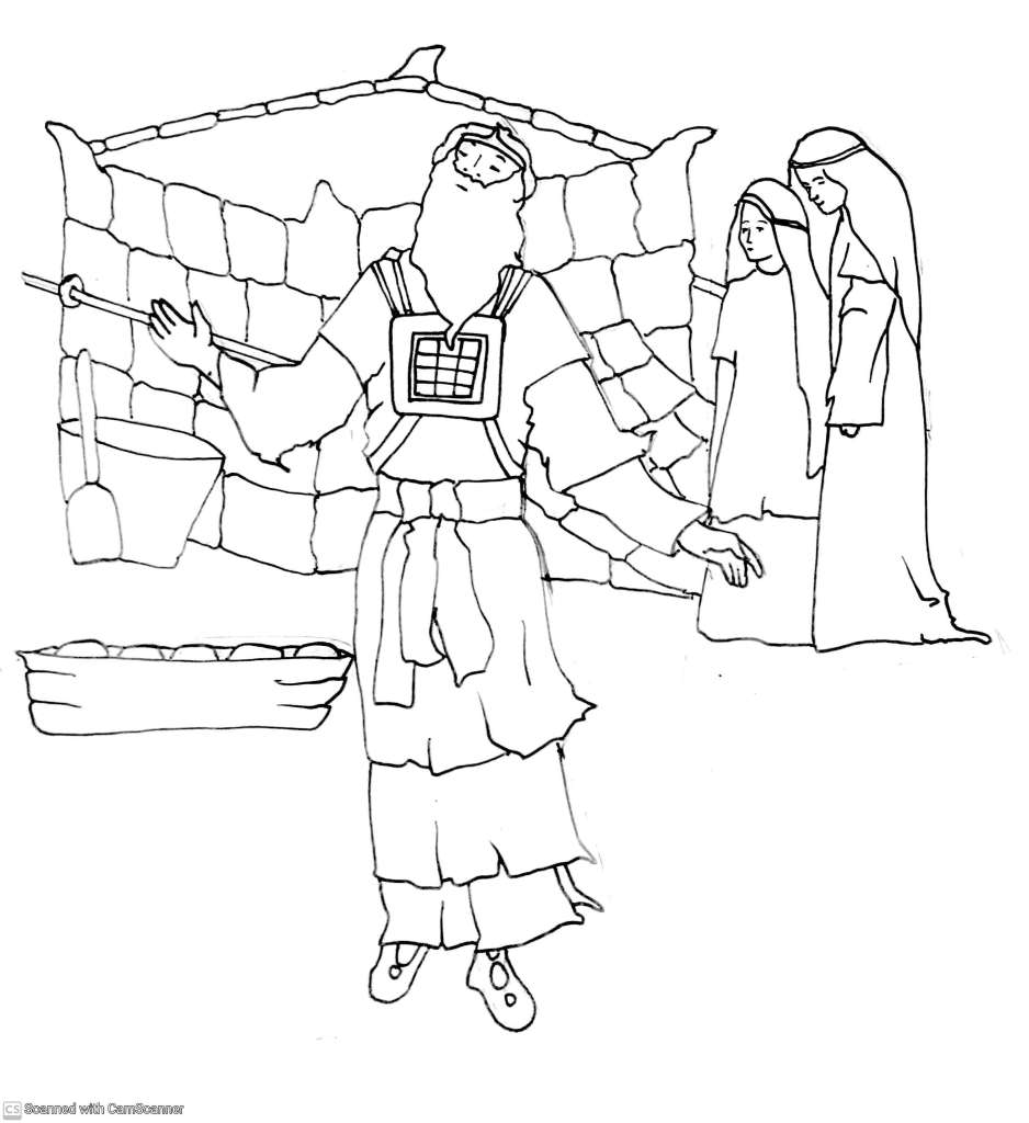 Aaron,with his sons, is seen near the alter of offering, in front of the meeting tent, dressed in his priestly garments for the first time.