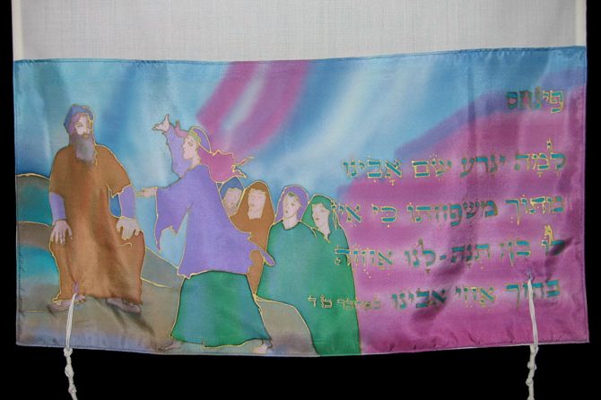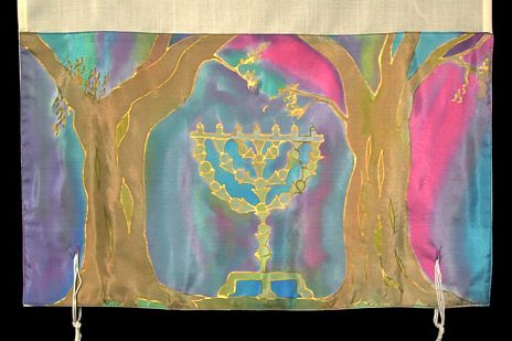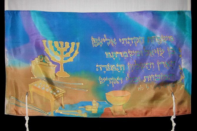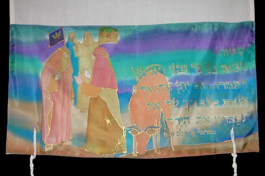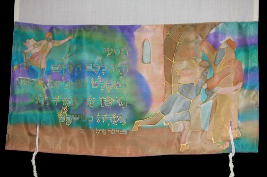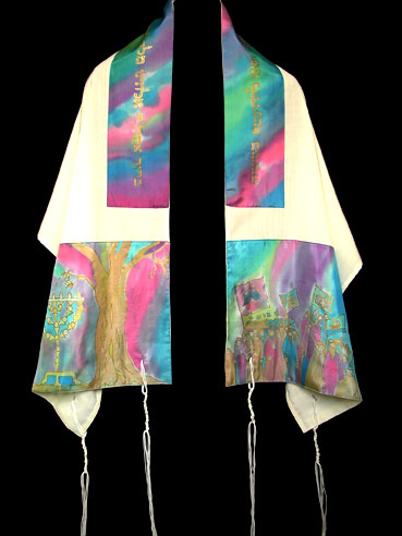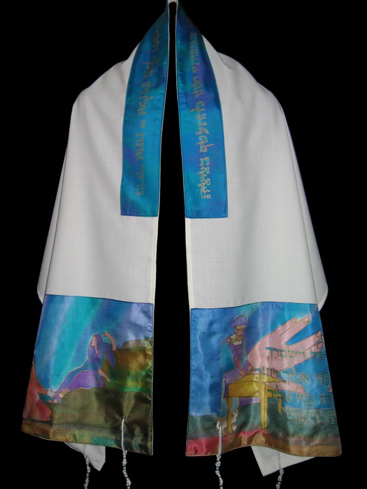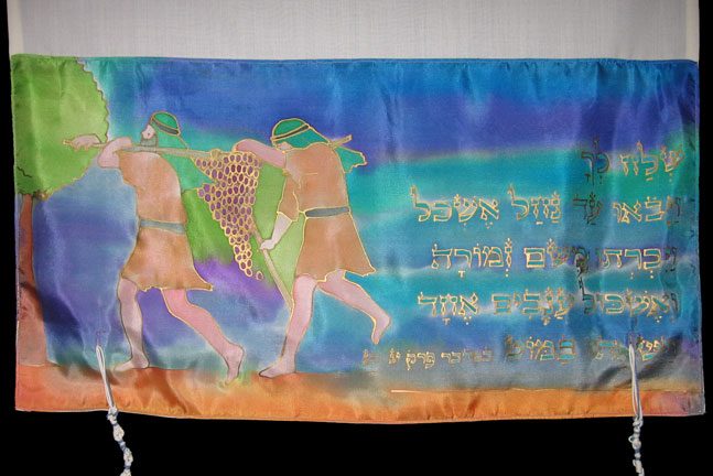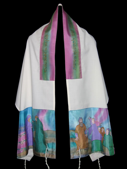 In Parashat Sh’lach, twelve messengers scout out the land of Canaan and return with exaggerated tales. Also in it, Jews are commanded with the mitzvah of tzitzit, which means they are to say a blessing over the tied threads, which included blue threads. For that reason the tallit is shown with blue threads.